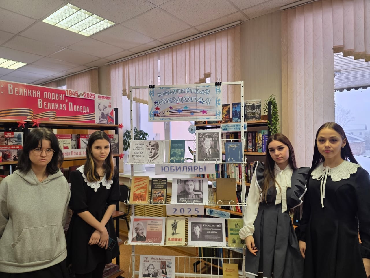 В рамках Недели молодежной книги в библиотеке прошел обзор книжной выставки «Юбилейный звездопад» Библиотекарь познакомила читателей с биографиями и произведениями выдающихся писателей-юбиляров 2025 года: